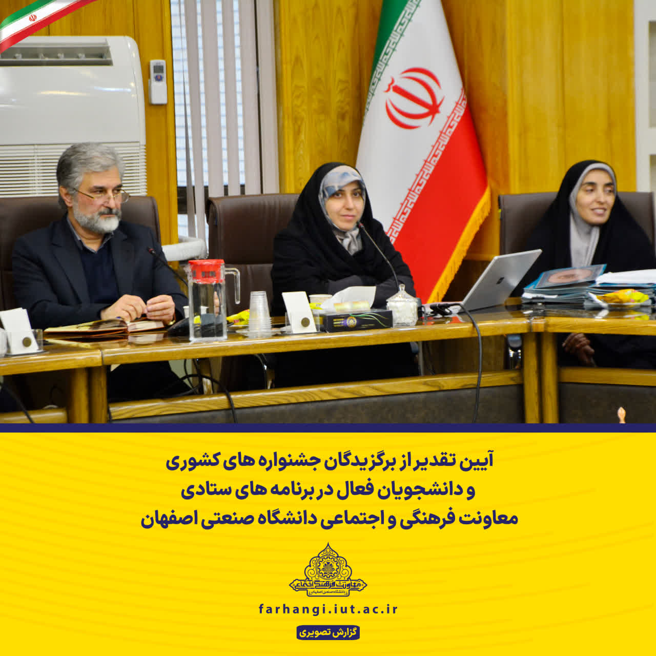 سرپرست دانشگاه صنعتی اصفهان و اعضای شورای فرهنگی طی مراسمی که به همت معاونت فرهنگی و اجتماعی این دانشگاه برگزار شد، از برگزیدگان جشنواره های کشوری و دانشجویان فعال در برنامه های ستادی معاونت فرهنگی و اجتماعی این دانشگاه، تقدیر نمودند.