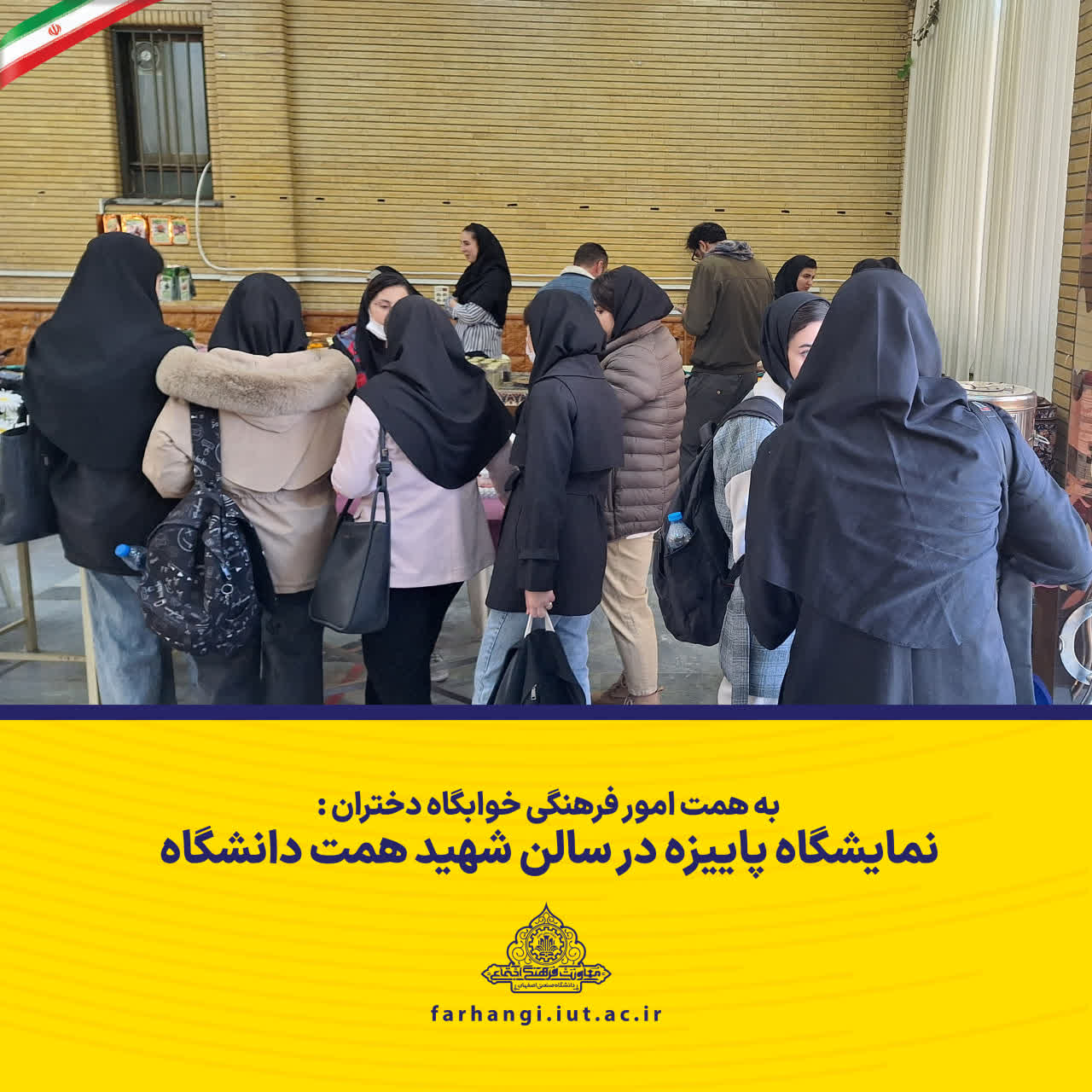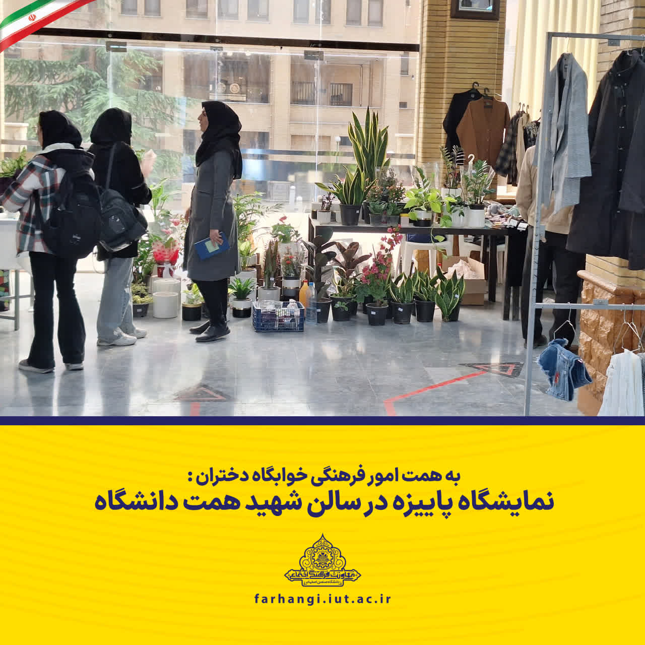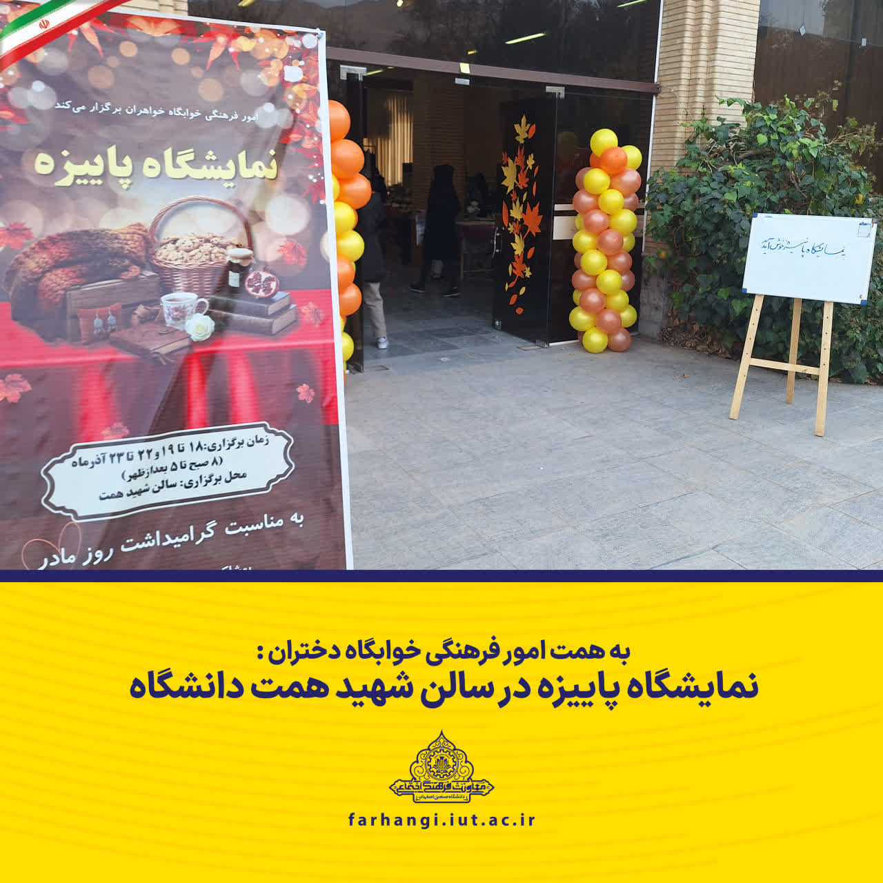 نمایشگاه پاییزه به مناسبت گرامیداشت روز مادر، امور فرهنگی خوابگاه دختران دانشگاه صنعتی اصفهان، نمایشگاه پاییزه را در روزهای 18 ، 19 ، 22 و 23 آذر ماه، از ساعت 8 صبح تا 5 عصر، در سالن شهید همت این دانشگاه بر پا کرده است.